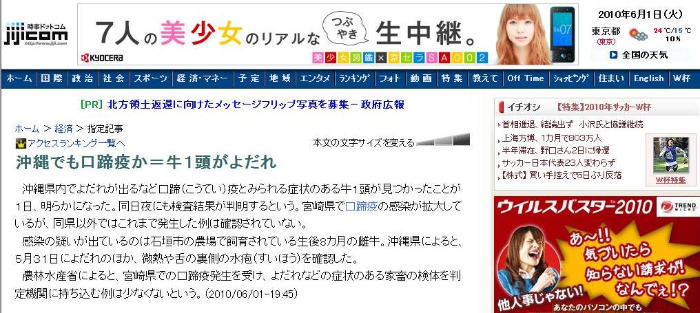 沖縄県内でよだれが出るなど口蹄(こうてい)疫とみられる症状のある牛1頭が見つかったことが1日、明らかになった。